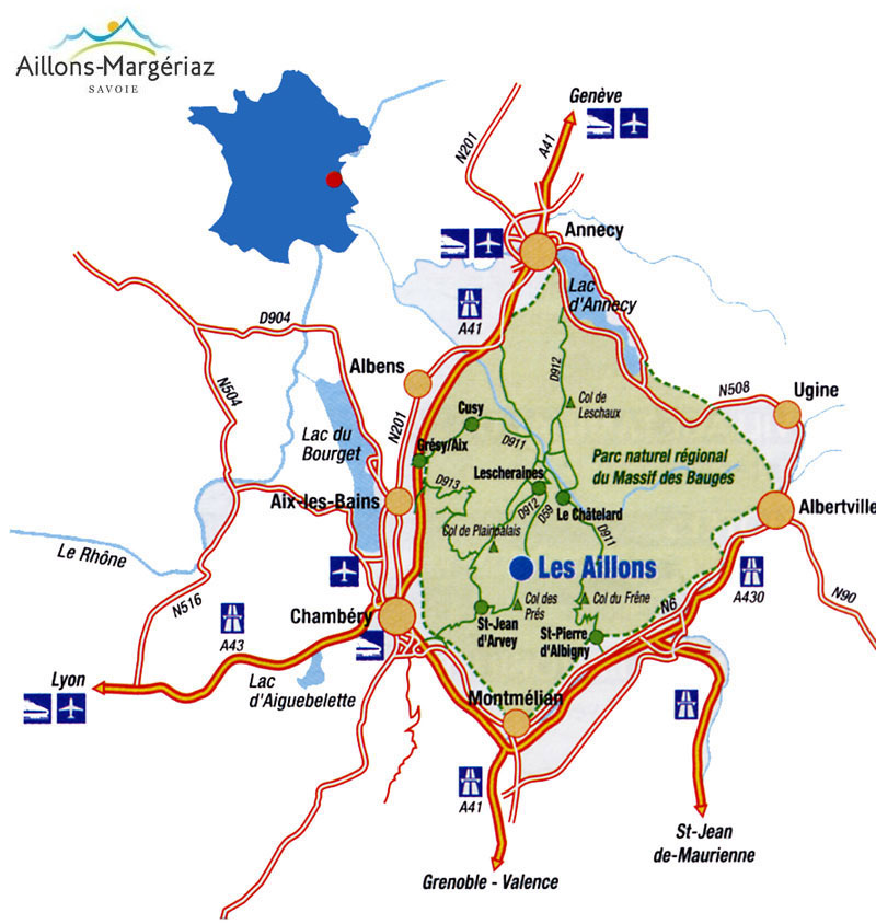 Autoroutes : A40 sortie Frangy Annecy, A41 sortie Aix-les-Bains nord, A49 sortie Montmélian.